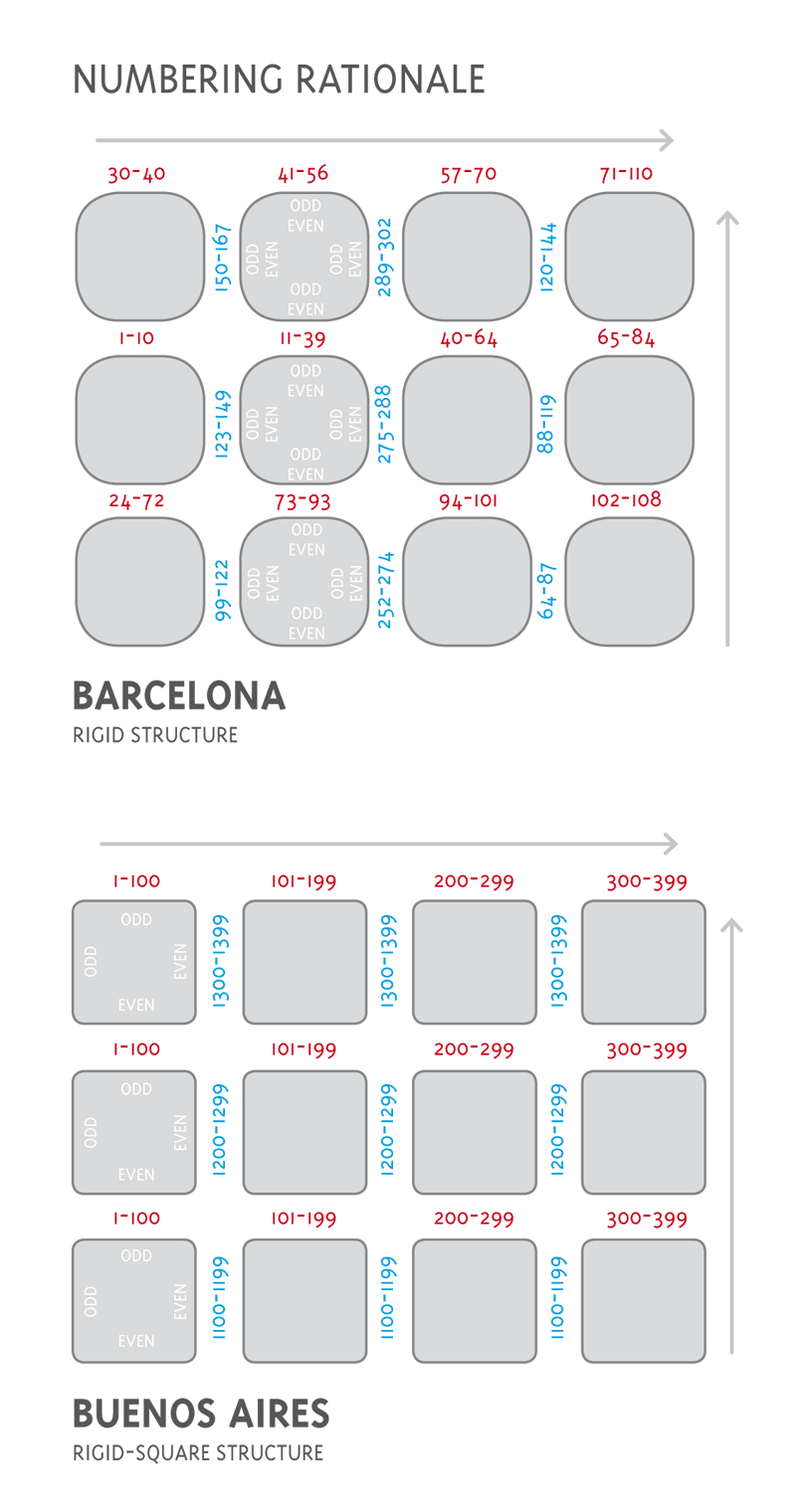 The rationale of the houses’ numbering: This type of information refers to the number attached to each house, building or office (some houses don’t have a number but a name instead, something quite common in Europe, but not in Argentina), and the rationale each city adopts to organise each house/building/office throughout the streets and blocks. In Argentina each block contains one hundred numbers, so all houses/buildings starting with the same digit are in the same block. This rationale is applied throughout all the streets and thus all parallel streets have the same numbers. Barcelona applies a different rationale, which sets that the quantity of houses/buildings per block varies from one block to another, so some blocks contain three house numbers, while others may contain ten. In addition, not all houses/buildings are numbered, which makes a bit difficult to find a place, and of course there is no number correlation between one block and its parallel block. Even numbers tend to be grouped in one side of the street and odd numbers on the opposite side. However, here in London, the rationale is as organic as the structure of the city. Even and odd numbers can be found on the same side of one street, and it is not a rule that they constantly increase or decrease, as there can be a gap in the frequency and the numbers can start from the beginning again.