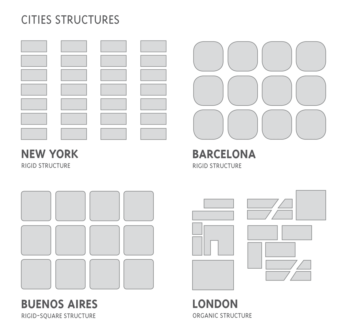 The structure: some cities have been built following a plan while others had had a less rational growing and development plan. However, in both cases the cities have a structure (what in design is called grid system), that when it is understood, it becomes easier to navigate through. Cities like New York and most from Argentina were built on rigid grids that make easier for foreign people to navigate and find a particular place once they can locate theirselves in a map, while cities like London and Lisbon are much more organic cities. In organic cities, finding two parallel streets it’s quite a challenge and thus they can be seen as more complicated to navigate. However, this characteristic can be used as an ”˜orientation-strategy’: if people knew in advance that most of the streets don’t follow a straight line, they would not rely on that and would walk around with this in mind. Some cities have a combination of both structures; such is the case of Barcelona, which has an organic structure in the oldest districts, like the Barri Gí²tic, and a rigid grid in the most modern districts like L’Eixample. It worth saying that although most cities merge both types of structures, they have one leading structure that defines the whole city.