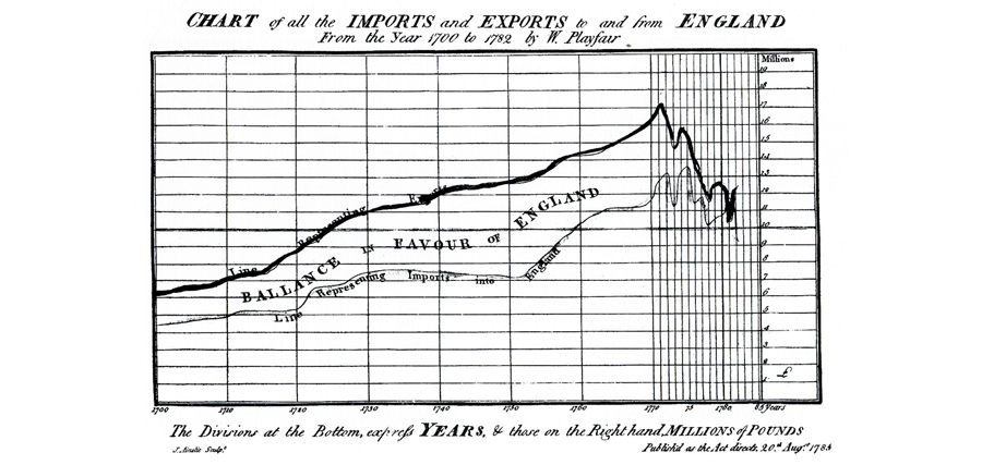 4. Charts and Graphs (1770-80s). Joseph Priestley created the first recorded graph of time depicted as a timeline, which was published in 1765. While in 1786 William Playfair published a great collection of graphics in his Atlas, The Commercial and Political Atlas (London), representing information about economics. The importance of Playfair’s study was the creation of a new graphic language that offered an alternative to the tabular presentation of information used prior to that date. Playfair said that: “Graphics are preferable to tables because graphics show data from a comparative perspective”