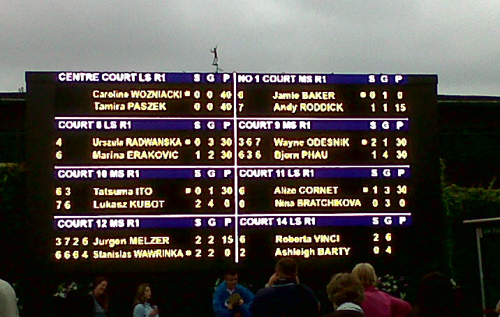 On the other extreme of the Centre Court and closer to Exit 1, a digital board gives live information about each match which is currently being played. However not all information can be seen at the same time, so you need to wait until the desired match shows up in the screen.
