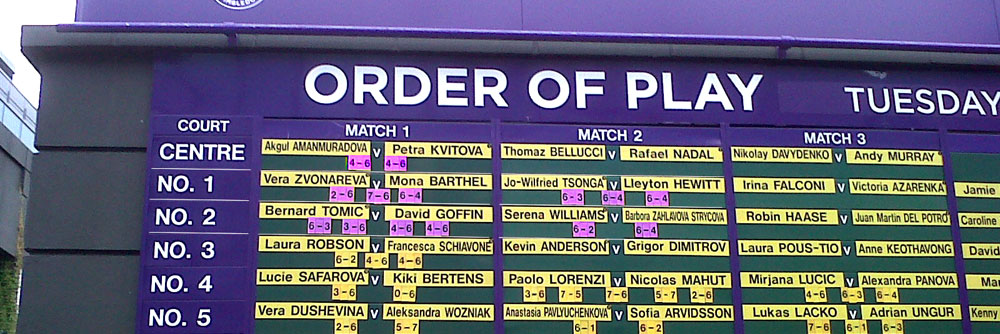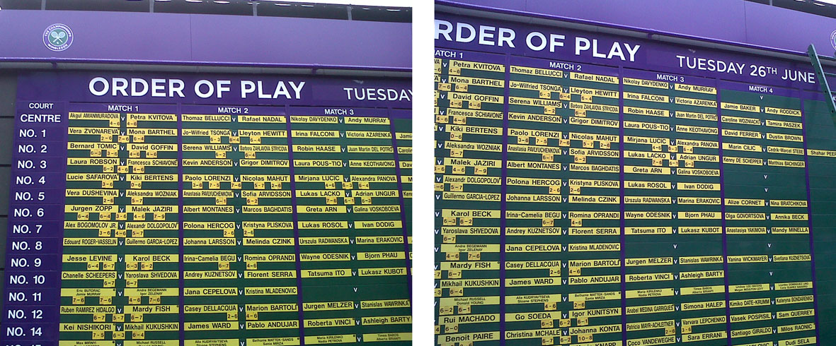 Rough example of the board with changes in colour and adding graphic elements. - Add (potential) starting times to the first match at each court would orientate new comers. Time-slots may not be included in the board as each court has fixed starting times and visitors can access this information in the booklets given with their tickets. E.g.: ”˜On Courts 2-19 play is provisionally scheduled to start at 11.30am for main draw matches (”¦) and at 11am for junior marches’. ”˜On Centre Court play will start at 1pm except on the final two days when play will start at 2pm.’ Nevertheless, it would greatly enrich the information given in the board, if it would be included on it as well.