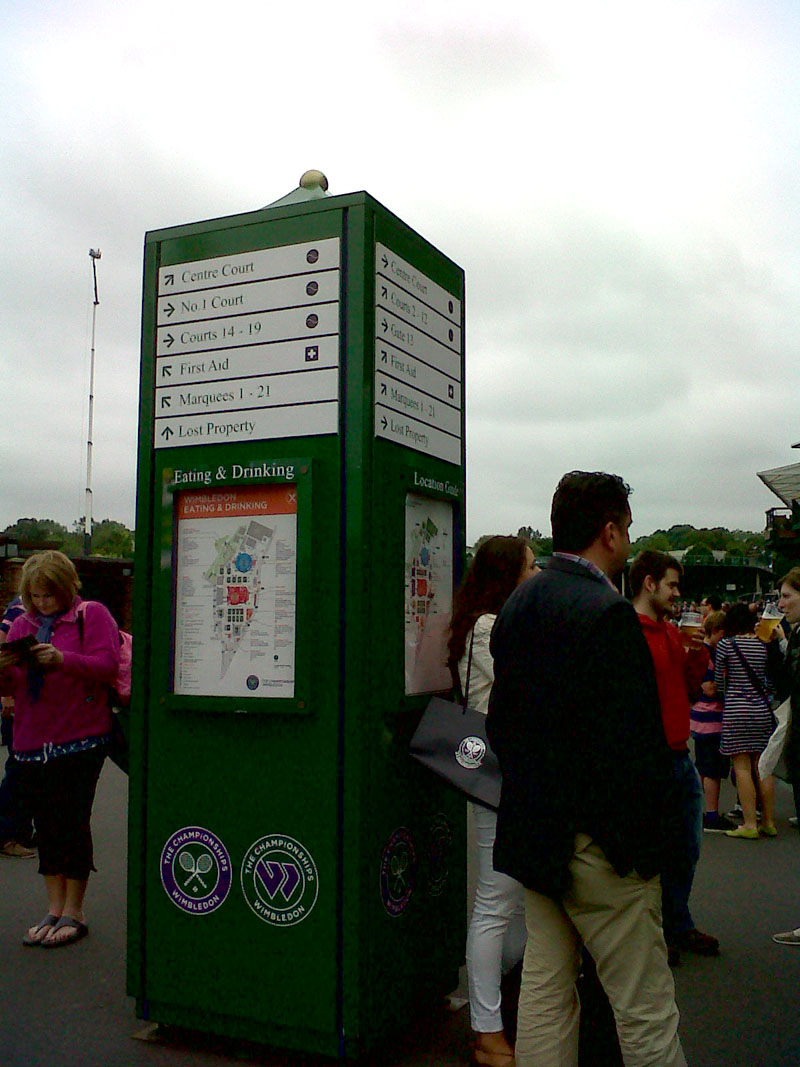 This year I finally decided to go and visit the Wimbledon tournament. Overall, I left that day having the feeling that every single detail has been planned ahead, including the wayfinding system. For those who are not that familiar with this 125-year old tennis tournament, at Wimbledon five major and four junior events are played simultaneously during two weeks (actually junior events start on the first Saturday). The first week is the busiest and matches are held one after the other during each day. 19 courts, the Centre Court, shops and restaurants constitute the massive open area referred as the Grounds. General passes give access to many facilities, including merchandising shops and food, and allow access to unreserved seating and standing on courts 3 to 19.