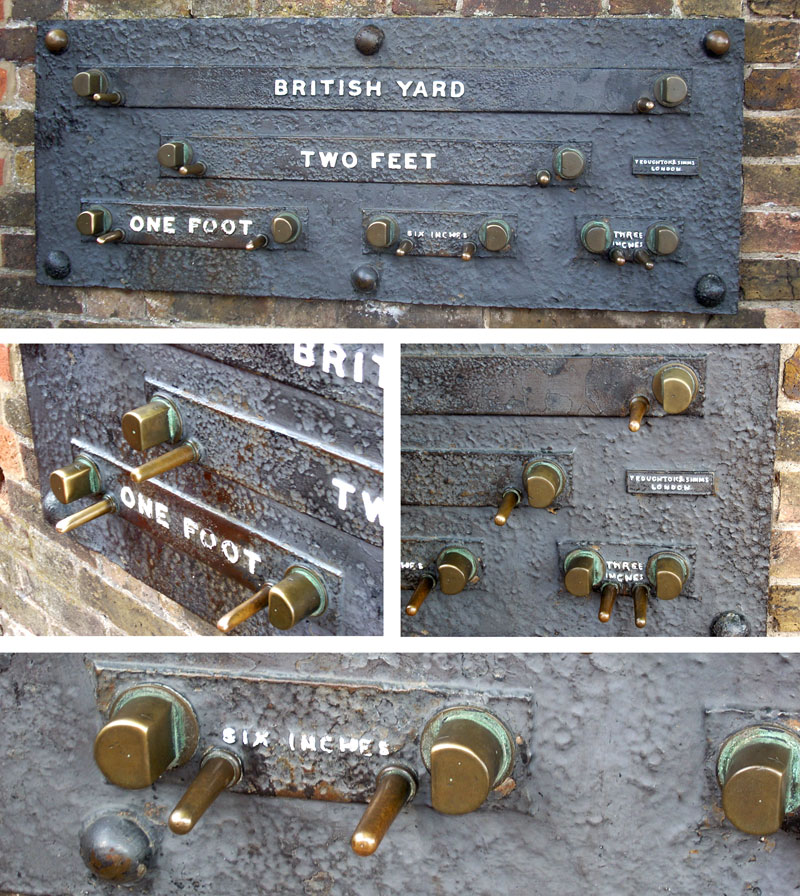In the entrance of the Royal Observatory, there is a bronze plate on the wall showing British length measures. The plate shows each measure in relation to the others. That enables the viewer to compare each unit with the other and get a clearer understanding of their relationships. Those not that familiar with units of length can see at a glance that 1 British yard equals 3 foots, for example. Particularly, I would have like to add the Metre there as a bar, slightly longer than that of the Yard.