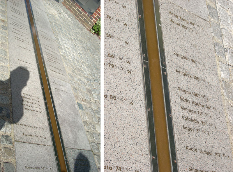 After that, once you actually enter into the building and walk across the patios, you find the Meridian Line on the floor (and a long queue of people trying to get photos of it). Names of capital and key cities are organised alongside the Line. They are placed correspondingly on the left (West) or right (East) of the line, according to their latitude. Although, they are all ordered in straight line, their longitudes are also indicated.