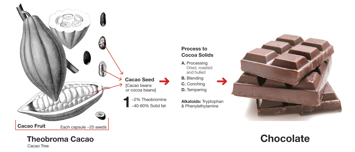 Aphrodisiac. Two chemical components of cacao solids (chocolate), tryptophan and phenylethylamine alkaloids, could produce a psychological effect on people’s desire. Although the amount of these neuroactive alkaloids, which contribute to feelings of happiness and euphoria, is pretty small in chocolate, it is believed that when people consume chocolate they feel happier, more energetic and alert.