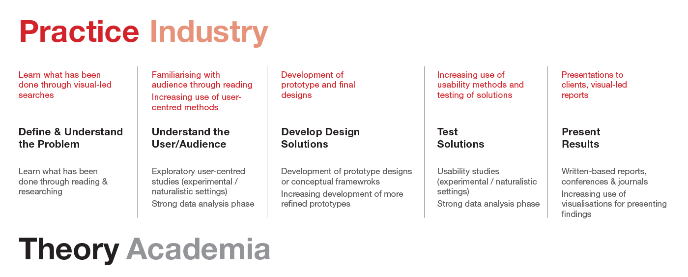 *NB: To give a more detailed view of the design research community this description is mostly based on human computer interaction and engineering design-related models. The communication design research community (particularly information and graphic design) presents a different scenario than the one described here (For a more extended description, read here).