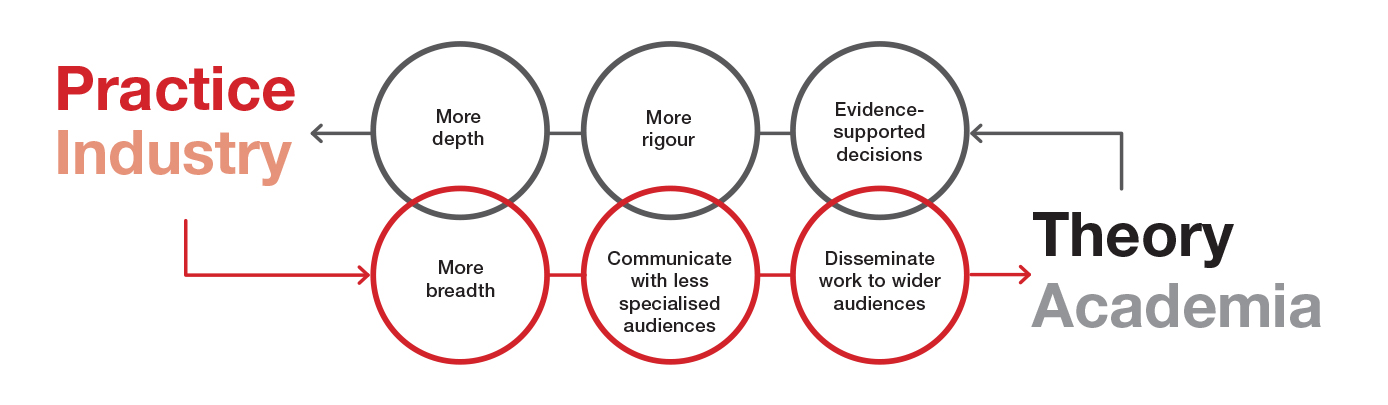 Much has been written and discussed about the gap between design practice (industry) and theory (academia), and how to bridge that gap has become a major current preoccupation. Although professional and research designers appear to be narrowing that gap by increasingly working on collaborative projects, little has been actually done to marry those communities. Misconceptions about what each community does and how each works are recurrent. Each time design is being practiced, researched or taught from one approach only and, therefore, excluding the other, the gap grows wider.