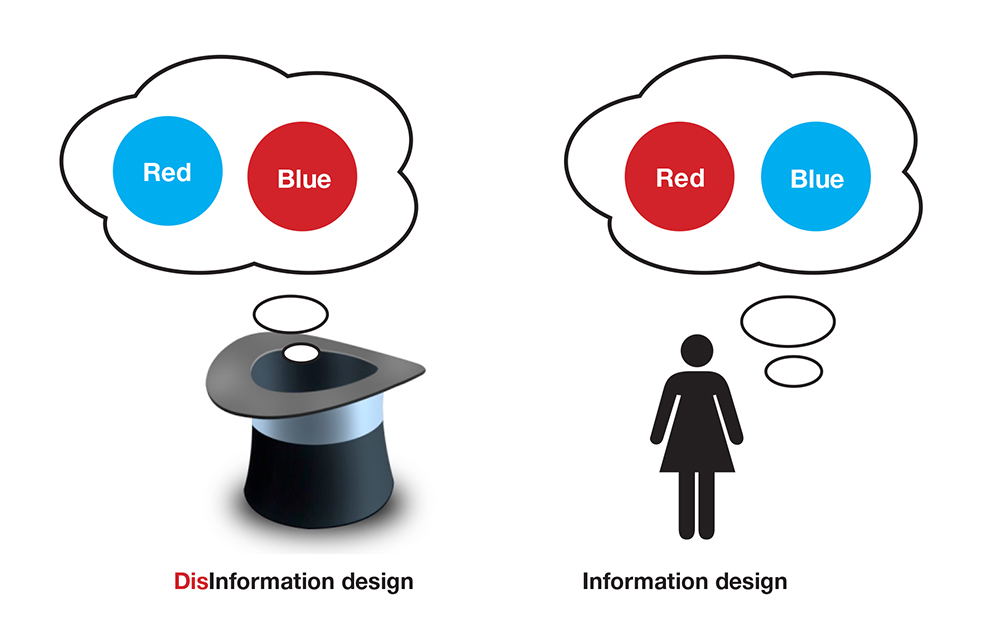 On the one hand, there are some commonalities between magic visualisations (i.e. disinformation design) and effective visualisations (i.e. information design), in the sense that both try to present a ‘seamless and convincing alternative reality’ (Marchak, 2000). For that, both filter information (choosing what to show and what to hide), and use similar techniques and tools, metaphors and user evaluations to ‘make the ordinary [raw data/content], look extraordinary [visual]’ (Marchak, 2000).