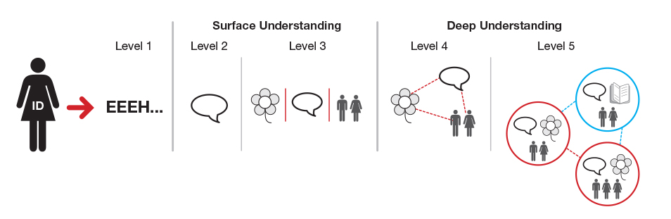 When we only reach a learning level 2 or a 3 about a problem situation, we are gaining surface understanding, but when we push ourselves and get into the problem reaching learning levels 4 or 5, we are achieving a deeper understanding. As information designers, these are the levels we should always aim for.