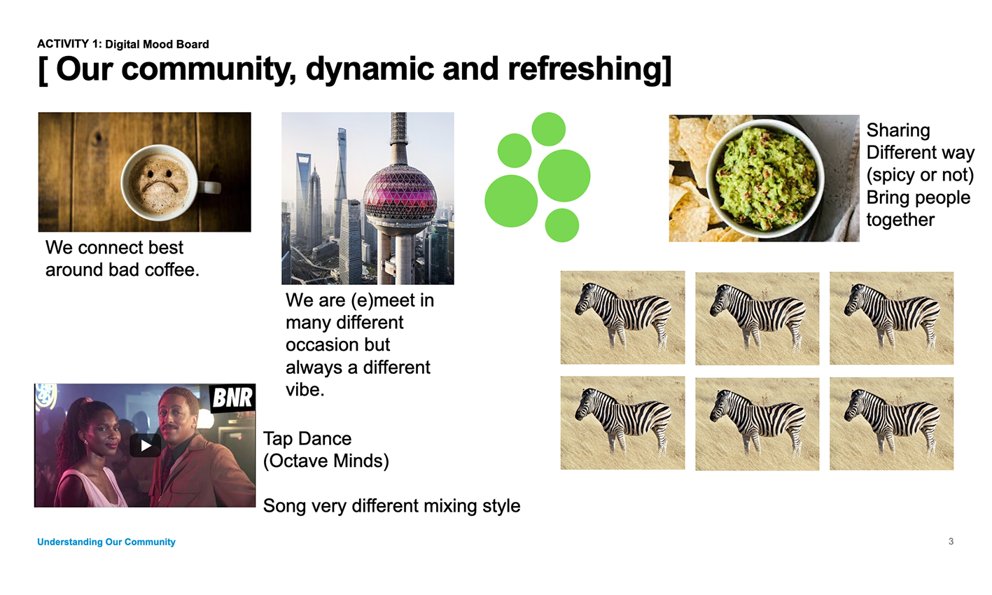 ACTIVITY 3: Creating digital mood boards. Design online group sessions or workshops to better understand people’s likes and dislikes, and what key concepts mean to them. Visual activities help participants articulate how they feel about a specific situation, for example, by creating a digital mood board. Participants are asked to attach a color, shape, smell, and a city, and create a collage to illustrate their emotions about a new product; or to represent how they feel about an existing design. Resulting mood boards would provide indicators of how people feel about the object of study and could inform future design decisions.