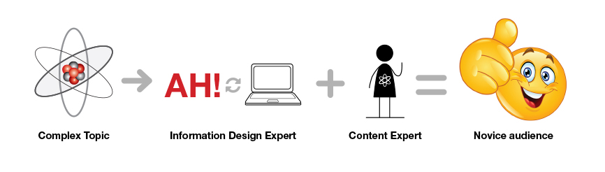 Information design expertise: Information designers do much more than creating pretty things. They structure, organize and transform content into visual forms that both are easier to understand and look good. To do this effectively, information designers possess a hybrid set of skills blending sensemaking knowledge (how people think, brain activities) with design knowledge. As David Sless explained, information designers have “a wide range of tools at their command and a substantial knowledge based on repeated experience which enables them to judge solutions that are most likely to work.” Of course, audience’s input should also be used to inform the process.