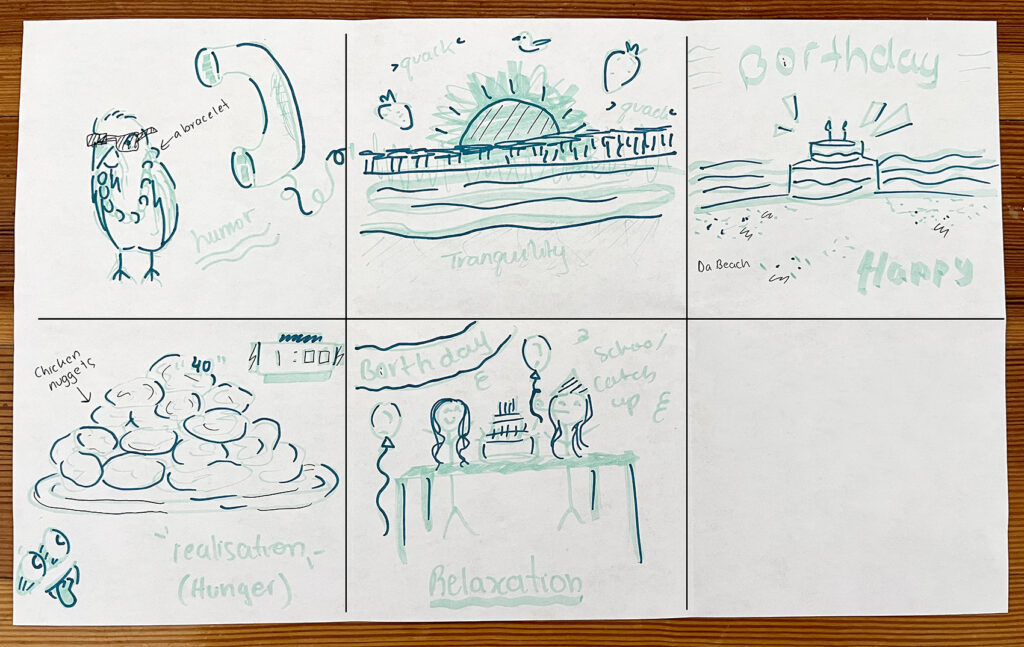 Activity. Working in groups of six, students took turns to share their positive experience with as much detail as they could with the other members, also showing the visual aid they brought. Students were asked to talk during at least 90 seconds, explain the specific emotion/s they felt, the time and place of the experience, what they were wearing and doing, whether they were alone or with other people, and any other relevant piece of information that could help the other members of the group empathize and feel the same emotion. While one student was sharing, the others were imagining how to visually represent both the positive experience and the emotion/s. Each student created visual vignettes representing scenarios of the other students’ experience that could help the respective person evoke a similar feeling. Students were also asked to write down the specific emotion that each student felt next to the respective drawing.